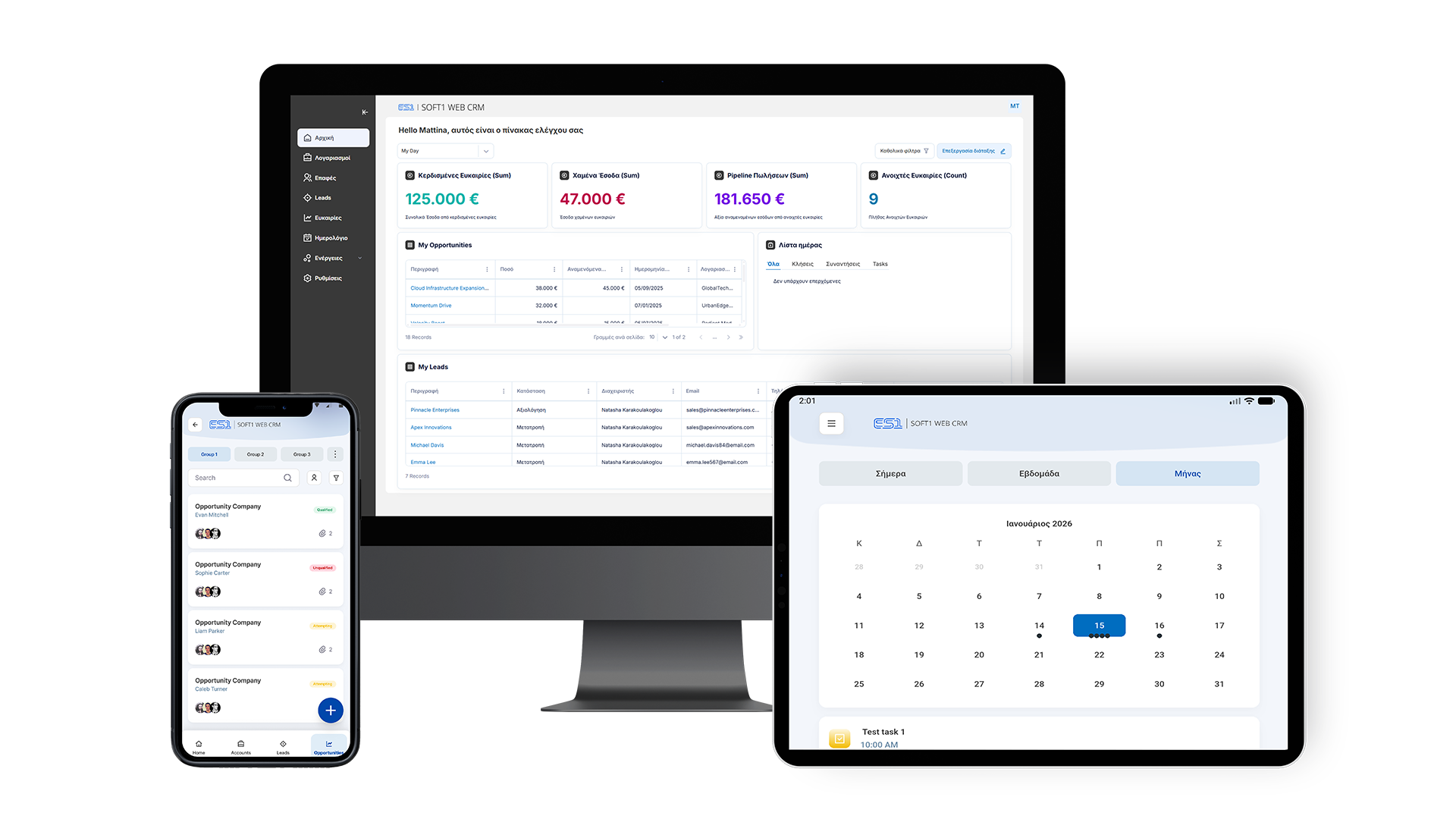 Αυξήστε τις πωλήσεις και ενισχύστε τις πελατειακές σχέσεις με το SOFT1 WEB CRM. Την AI-driven πλατφόρμα που ενοποιεί δεδομένα, ομάδες και εργαλεία.